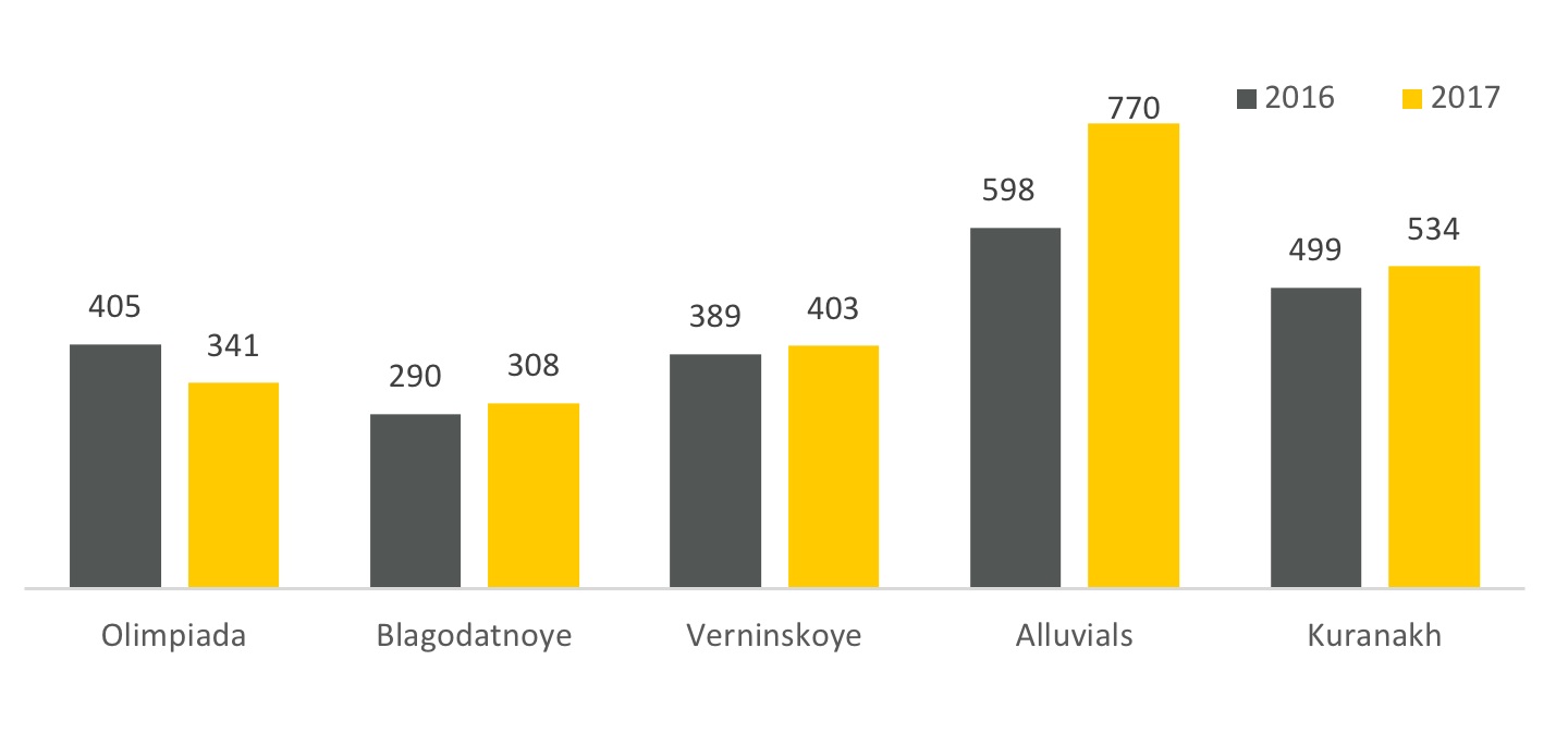 At Blagodatnoye, 2017 TCC amounted to $308 per ounce, up 6% compared to the previous year, primarily due to the local currency appreciation and negative impact of lower grades in ore processed (following the intensification of mining activity at lower-grade sites). Notably, in rouble terms TCC decreased following the ongoing debottlenecking of throughput capacities and decline in cost per tonne of ore mined envisaged by mining plan for the respective years.