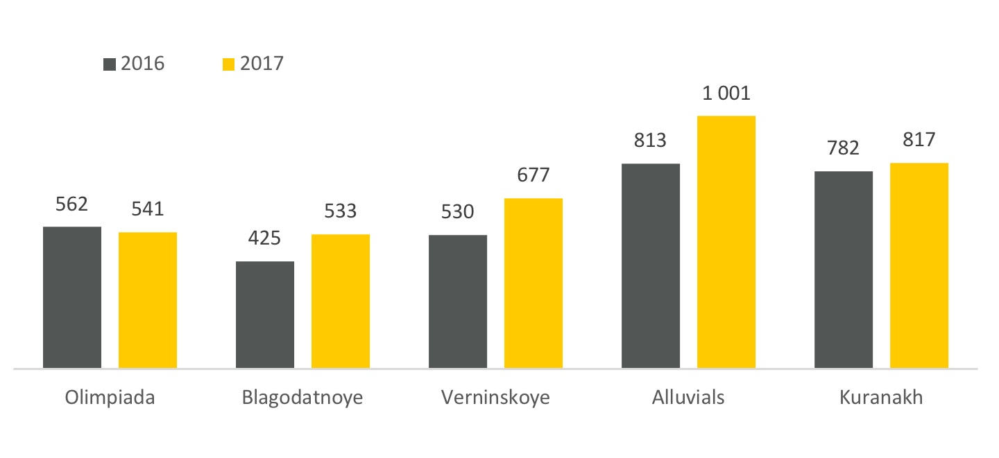 AISC at Olimpiada remained almost flat compared to prior year as lower TCC were offset by an increase in sustaining capital expenditure and stripping expenses. At Blagodatnoye, AISC increased to $533 per ounce as a result of a planned increase in stripping activity (rock moved volumes rose 55% during the year). Verninskoye posted a 28% increase in AISC from the previous year due to higher stripping expenses and sustained capital expenditure. At Kuranakh, AISC increased to $817 per ounce driven by higher TCC for the period.